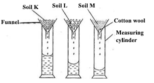 The funnels in the diagram below contain equal amounts of different types of soil labelled K, L and M. Equal volumes of water were poured onto each soil at the same time and allow to drain for 20 minutes.