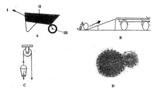 Name the parts labelled I, II and III of device A when it is considered as a lever.