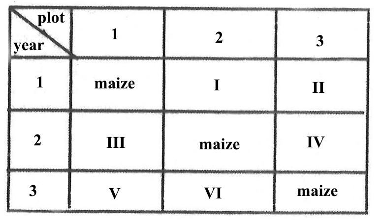 4. A farmer cultivated soya bean, yam and maize on a farm in a rotational programme as illustrated below.